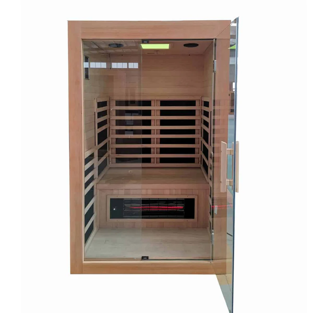Our Ultimate Full Spectrum Infrared Sauna features Ultra-Low EMF Carbon Fiber Heating Elements plus advanced LED Chromotherapy Light Therapy. All new crisp design features Edge to Edge Glass Door, digital controls, Bluetooth symphony sound system and Full Spectrum NIR, MIR and FIR Infrared heat.